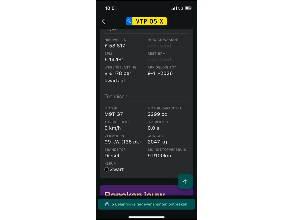 | Vermogen(pk) | 136 pk | Verbruik snelweg | - km/lt |