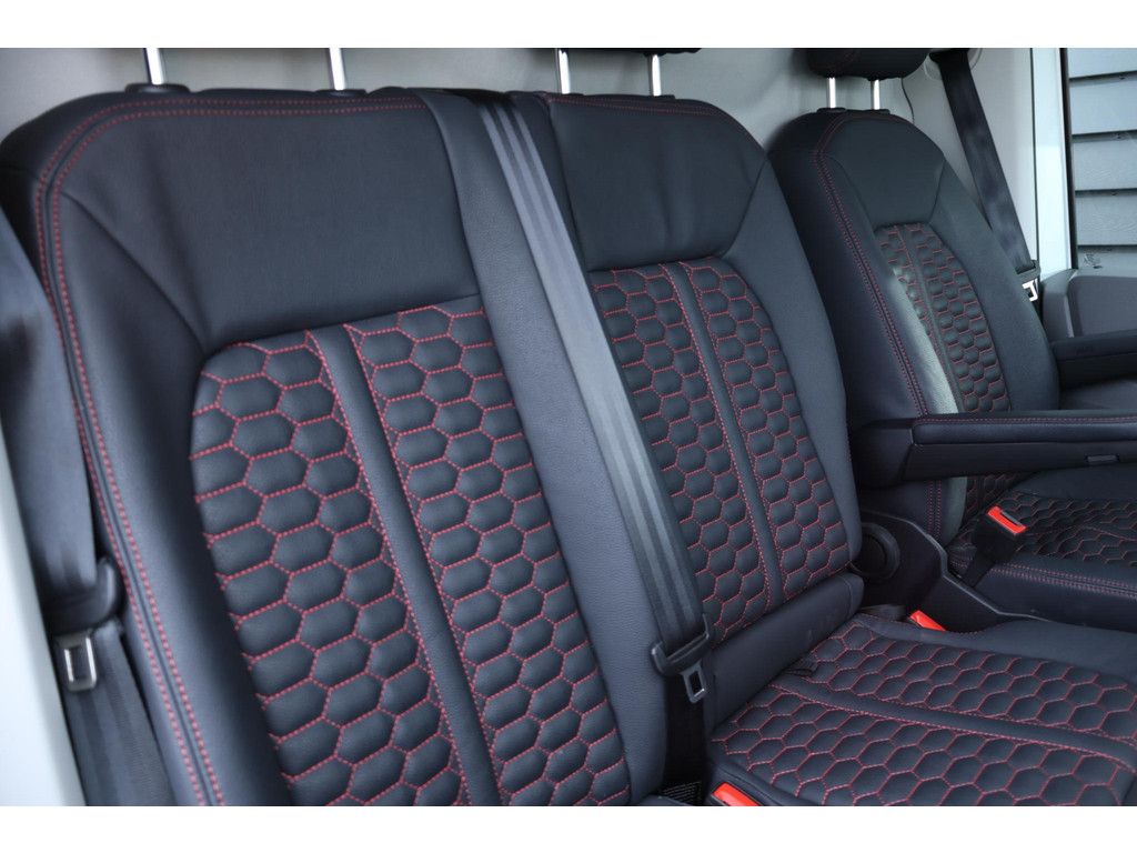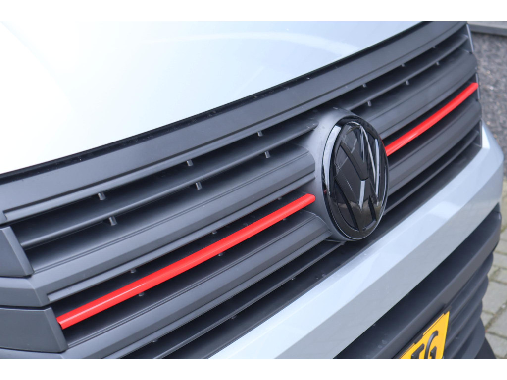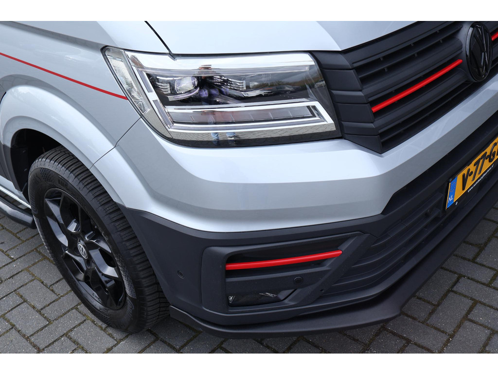 Deze Volkswagen Crafter uit 2024 heeft een stoere en complete uitstraling. De bus is voorzien van spoilers voor & achter, sidebars, zwarte VW-logo’s, een zonneklep, lederen bekleding met rode stikstel en fraaie 18 inch zwarte velgen.